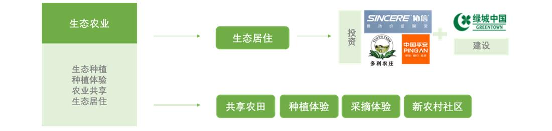 ——生态农业:在业态上打造了生态种植设施农田、家庭农庄、多利桃花源高档田园别墅区、农村新型社区等。其中多利桃花源,由成都多利、平安集团、协信集团投资,绿城集团负责代建,打造成为高端生态居住社区;家庭农庄实践共享农业理念,统一对原有农民住宅进行规划改造经营,配套周边农田,向游客租赁,进行生态种植体验和农事活动,有效集合了生态种植、农业共享、生态居住、社区农产品供应等功能于一体。