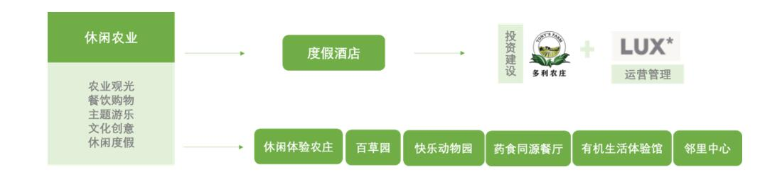 ——休闲农业:打造包括邻里中心、有机生活体验馆、休闲体验农庄、百草园、快乐动物园、药食同源餐厅、度假酒店等项目。其中度假酒店由成都多利投资建设,建成后全球著名的法国LUX酒店管理集团负责运营管理,营造乡村旅游度假新体验。实现了农业观光、主题游乐、餐饮购物、文化创意、休闲度假复合化发展。