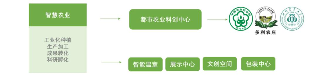 ——智慧农业:打造了包括都市农业科创中心、文创空间、智能温室、成果展示中心、产品分拣包装中心在内的农业科技创新业态。其中的农业文创空间建面约2000平方米,集聚了一批创意农业企业;“都市农业科创中心”则由中国农科院、四川农业大学和上海有机蔬菜工程技术研究中心合作成立,承担工业化种植、农产品生产加工、科技成果转化、科研孵化、有机蔬菜行业标准研究的功能,并为入驻的农业创客、合作社提供技术辅导和支撑服务。