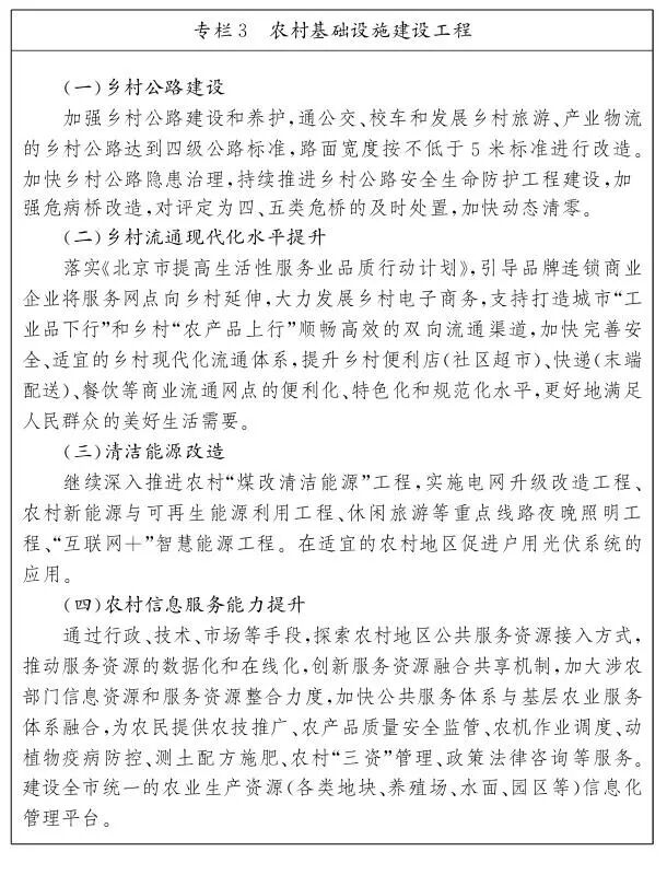 加快乡村清洁能源建设。加快推进平原地区村庄冬季清洁取暖工作,结合2022年北京冬奥会冬残奥会延庆赛区周边村庄的“煤改清洁能源”改造,积极推进山区村庄冬季清洁取暖试点工作。探索可再生能源技术在村镇采暖领域的应用。推动供电、供气设施向农村进一步延伸。加强户用光伏系统在农村地区的应用,加强电网升级改造,加快建设结构合理、技术先进、供电可靠、节能高效的供电网络。