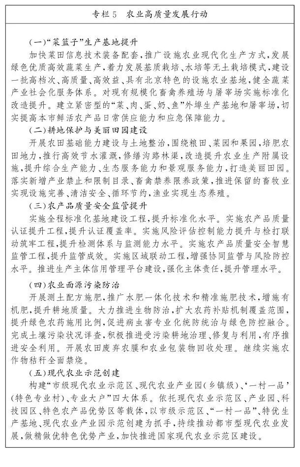 坚持质量兴农、绿色兴农、品牌强农,选育特色农产品,培育名优品牌,以建设北京农产品绿色优质安全示范区为主要抓手,同步推进国家现代农业示范区、国家农业可持续发展试验示范区、国家农产品质量安全市、国家食品安全城市创建。积极构建现代农业产业体系、生产体系、经营体系,不断完善农业社会化服务体系、生态保护体系和科技支撑体系。