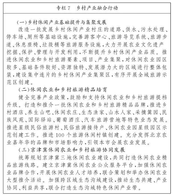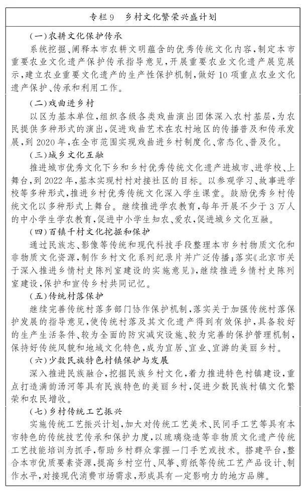 发展乡村特色文化产业。围绕大运河、长城、西山永定河“三大文化带”建设,打造一批充分体现古都文化、京味文化、红色文化、创新文化的乡村文化产业展示区。鼓励建设集农耕体验、田园观光、科普教育、文化创意、乡村游乐于一体的休闲农业创意园。推进文化创意和设计服务与农业联动发展,提高农业创意和设计水平。深入挖掘民族乡村文化资源,建设少数民族特色村镇。大力推动农村地区实施传统工艺振兴计划,培育具有京味特色的传统工艺品牌。积极开发北京传统节日文化用品、民间艺术和民俗表演项目,促进文化资源与现代消费需求有效对接。推动乡村文化与乡村旅游、休闲农业等深度融合,以文化振兴促进农村一二三产业融合发展。