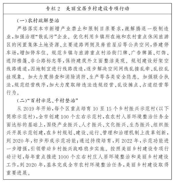 到2020年,乡村振兴取得重要进展,制度框架和政策体系基本形成,率先全面建成小康社会的目标如期实现。美丽乡村建设取得重要进展,农村环境整治任务基本完成,重点地区农村污水处理设施基本实现全覆盖;农业标准化生产、农业高效节水灌溉基本实现全覆盖,全市整建制创建成为国家农产品质量安全市、国家食品安全城市;现行标准下低收入农户家庭人均可支配收入超过标准线,低收入村全部消除;公共文化服务体系示范区建设取得显著成效;农村基层组织规范化建设进一步加强,低收入村和软弱涣散村的党组织实现全部提升、全面转化;党的农村工作领导体制机制进一步健全,乡村振兴战略领导责任制全面落实。