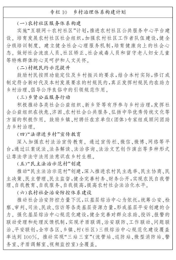 加强法治乡村建设。按照全面建设法治中国首善之区的要求,推动落实“谁执法谁普法”的普法工作责任制。深入推进“法律进乡村”宣传教育活动,以“村村通”网络为普法平台,提高农民法律素养,引导干部群众尊法学法守法用法。增强基层干部法治观念、法治为民意识,把政府各项涉农工作纳入法治化轨道。依法落实村民委员会、农村集体经济组织、农村经济合作组织的特别法人地位和权利。建立农村组织运作的规范程序机制,梳理发布村党支部、村委会、村务监督委员会、村民会议、村民代表会议的职责清单。综合运用集体资产第三方审计等措施,进一步规范村干部的履职行为和权力运行。在乡镇(街道)普遍建立实体化综合执法中心,下移执法重心,配齐配强基层执法人员,实现联合执法向综合执法转变。建立健全乡村调解、区级仲裁、司法保障的农村土地承包经营纠纷调处机制。完善农村公共法律服务体系,利用现代科技、通过多种平台提升公共法律服务质量,推进政府购买法律服务机制,加强对农民的法律援助、司法救助和公益法律服务。深入推进法治区(乡、镇)、民主法治示范村等法治创建活动,深化农村基层的法治化治理。到2020年,实现区、乡镇、村三级公共法律服务实体平台全覆盖。