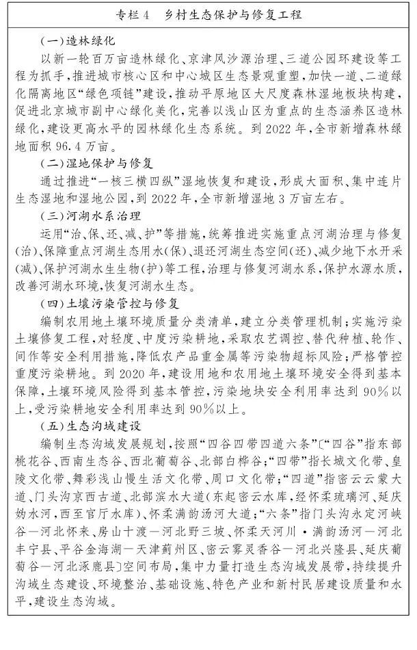 完善生态、文化保护格局。顺应乡村功能由农业和居住功能向生态、宜居、休闲、文化等多功能拓展趋势,重点加强生态、文化格局构建。坚持山水林田湖草系统治理,山区、平原统筹规划,城镇、乡村相互沟通,构建多类型、多层次、多功能、成网络的“一屏、三环、五河、九楔”(“一屏”为山区生态屏障;“三环”为一道绿隔城市公园环、二道绿隔郊野公园环、环首都森林湿地公园环;“五河”为永定河、潮白河、北运河、拒马河、泃河为主构成的河湖水系;“九楔”为九条连接中心城区、新城及跨界城市组团的楔形生态空间)高质量绿色空间体系,筑牢乡村发展的绿色基底。加强乡村历史文化和农业遗产保护与传承,依托大运河、长城、西山永定河三大文化带,建设具有平原特色、浅山特色与深山特色的三类风貌区,构建全覆盖、更完善的城乡历史文化保护体系。